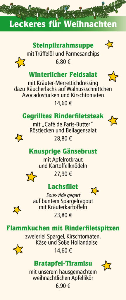 Our monthly menue for December 2025 (except December, 25th and 26th).